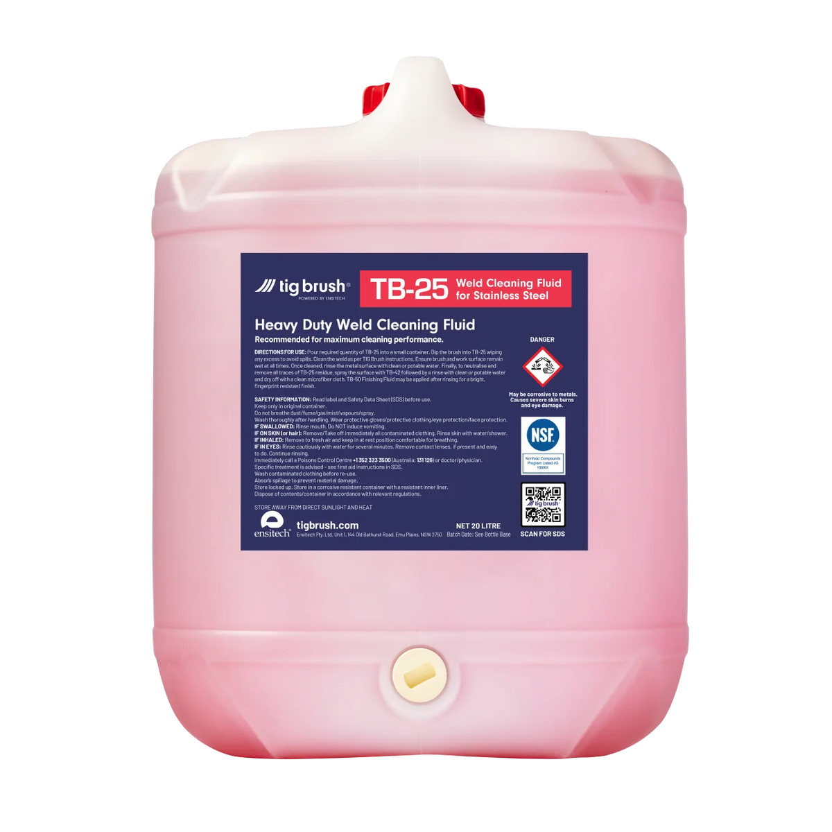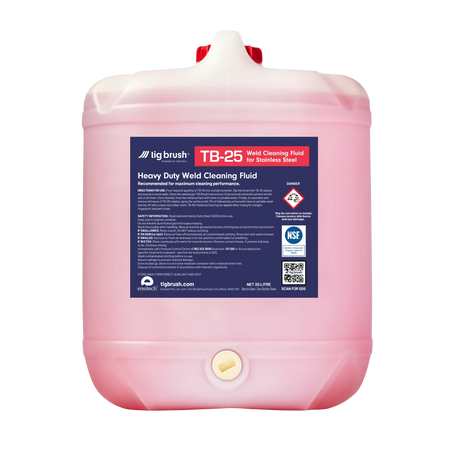 El TB-25 es el líquido más efectivo de la línea de TIG Brush, con una fórmula altamente concentrada que proporciona una limpieza rápida y efectiva de soldaduras en acero inoxidable, así como pulido y pasivación. Además, se distingue por su alto desempeño y calidad. Se recomienda neutralizar la superficie con TB-42 después de la limpieza para obtener los mejores resultados. Número de registro NSF: 150001 NS.