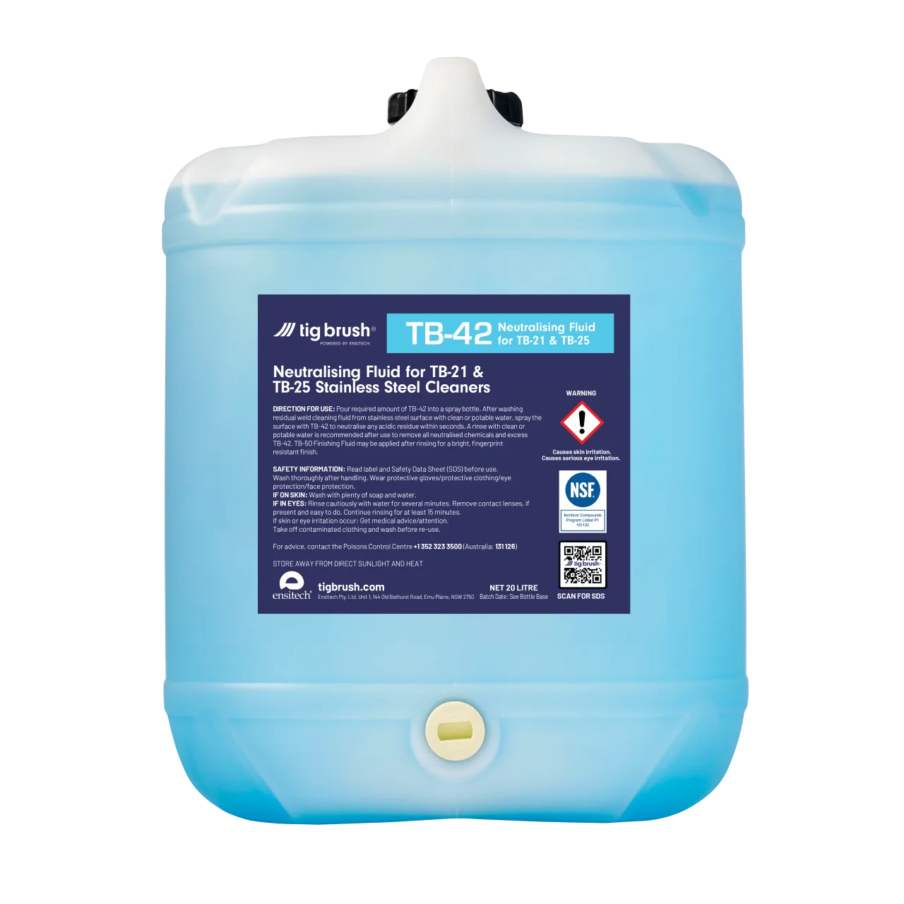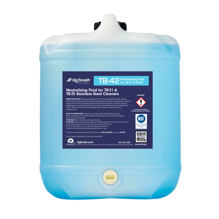 TB-42 es un líquido neutralizante no peligroso, no inflamable y no corrosivo de TIG Brush diseñado específicamente para neutralizar los fluidos TB-21ND y TB-25 sin generar productos tóxicos o corrosivos. Utilizar el fluido neutralizante TB-42 es esencial para asegurar que se pueda eliminar cualquier residuo ácido de la superficie de trabajo. Número de registro NSF: 151122 Código de categoría NSF: P1