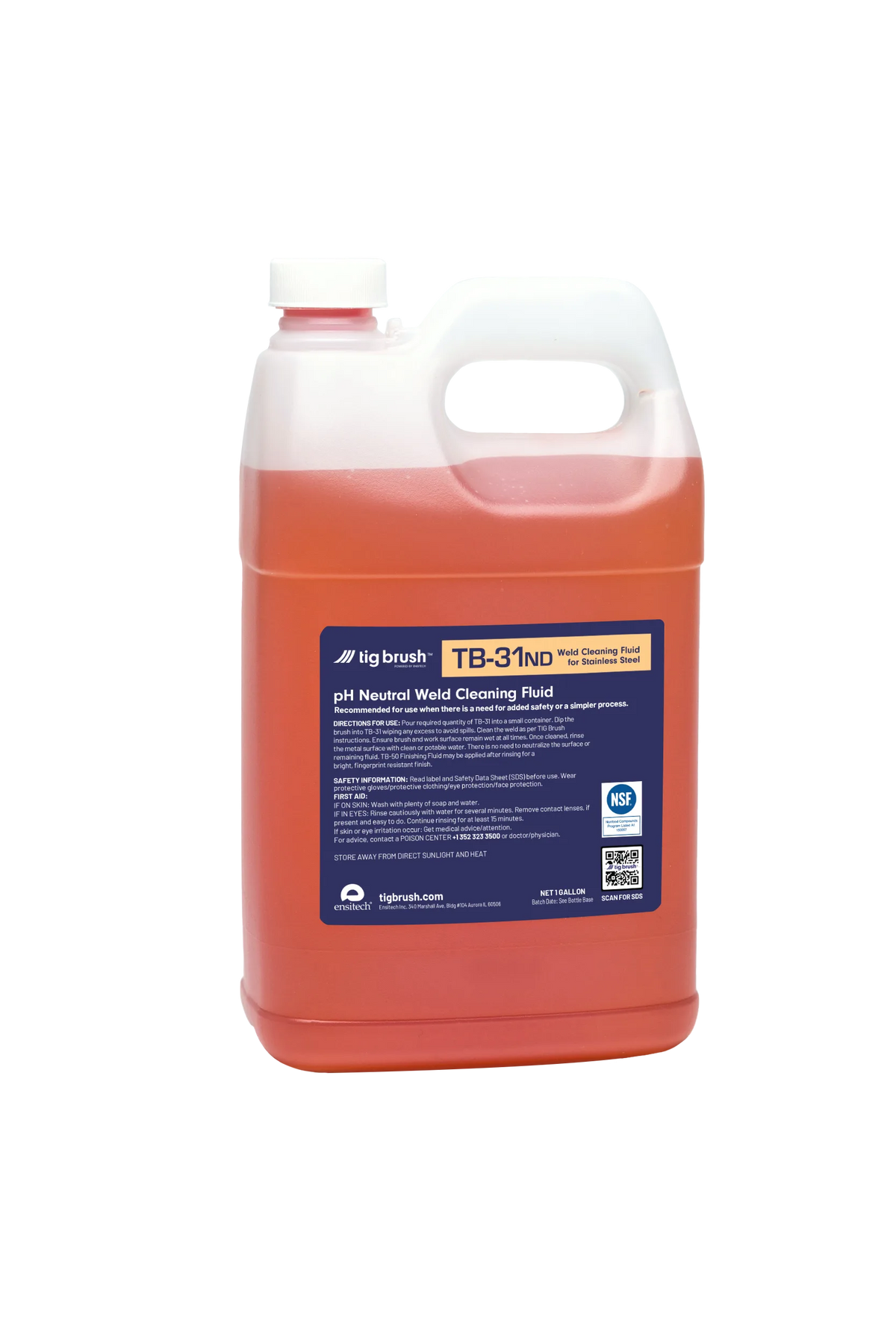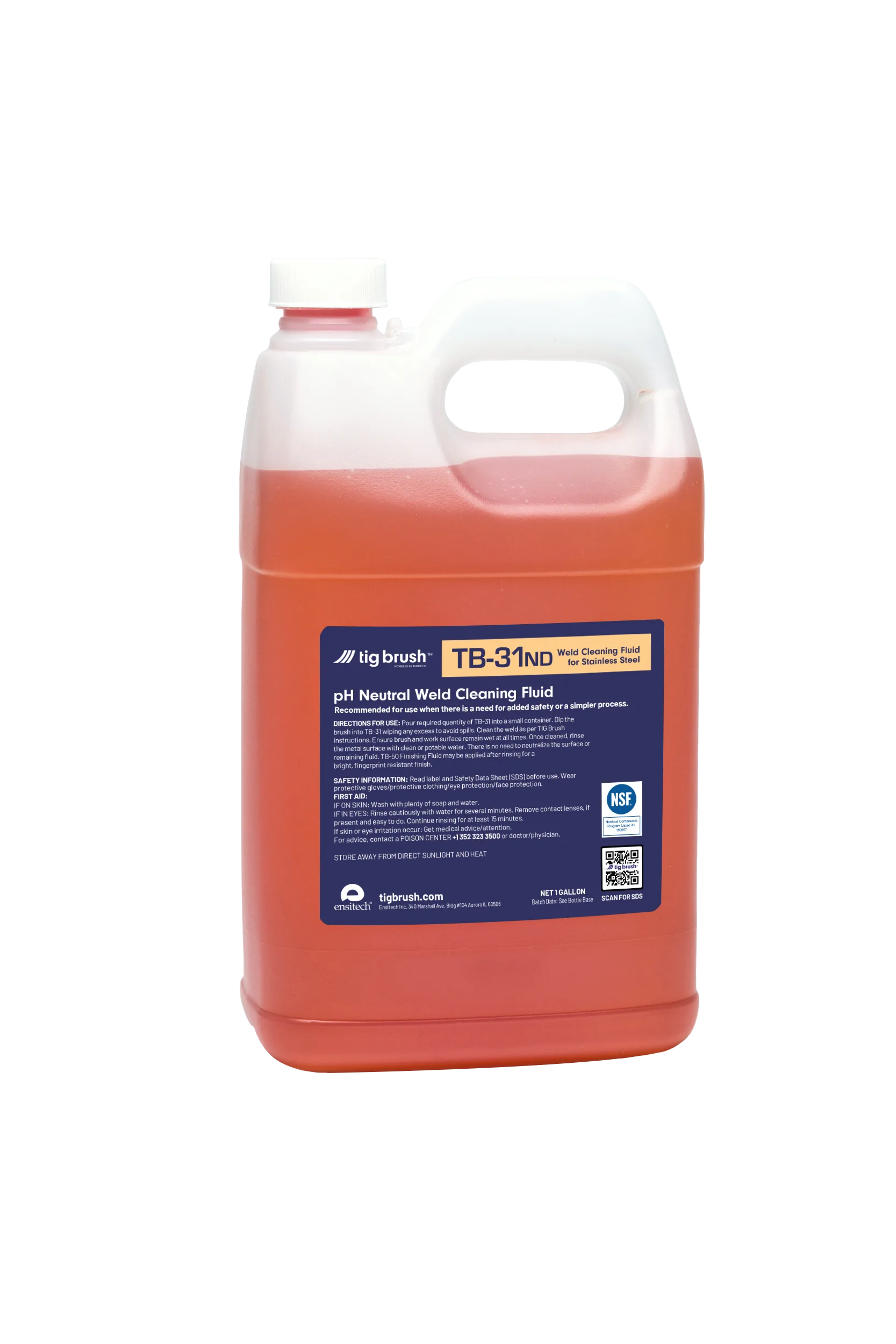 TB-31 ND es un líquido patentado de TIG Brush para limpieza de soldaduras con pH neutro, ideal para aquellos casos en los que se requiere una mayor seguridad. A diferencia de otros fluidos, no necesita de una operación de neutralizado. El TB-31ND limpia y pasiva las superficies de acero inoxidable, sin embargo, no tiene un efecto pulidor. Además, este fluido no altera las superficies altamente pulidas. Resulta especialmente adecuado en entornos delicados, como los sectores de alimentación y bebidas, famacéutico y petroquímico. Su uso garantiza la máxima seguridad durante su aplicación, almacenamiento y transporte. Número de registro NSF: 150057 Código de categoría NSF: A1